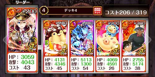 左から、リヴェータ(属性特効/遅延)、ペンプッチン(連撃/ダメブロ)、ウラガーン(攻撃UP/毒)、マロマル(チェイン攻撃UP/特効大魔術)、コナン&平次(属性特効/ダメブロ解除)